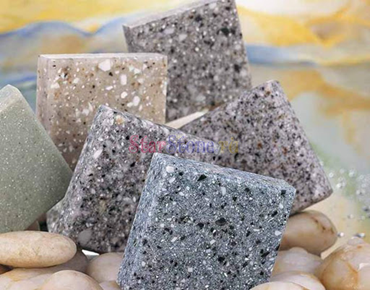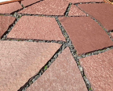 Кварцит. Более дорогостоящий материал. Цвета изменяются от красновато-розовых до серовато-черных оттенков. Большие плоские куски имеет глянцевую поверхность. Гладкие камни выглядят благородно, но представляют опасность, так как при контакте с водой (дождем или снегом) очень скользят.
