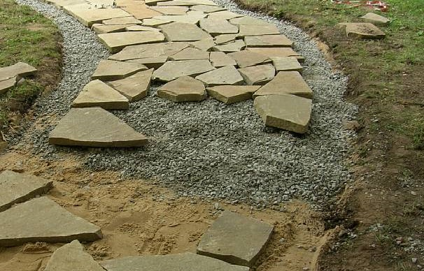 Технология мощения предполагает обязательное проектирование дорожки, ее оконтуривание на местности. Сначала разрабатывают дизайн, выбирают нужный вид природного камня, рассчитывают примерное количество. Заказав все необходимое, с помощью колышка и шнура размечают границы тропинки с отступом на 8-13 см с обеих сторон. Выкапывают верхний слой почвы (примерно 15-35 см) – засыпают траншею щебнем или дренажем на 1/3 от высоты.